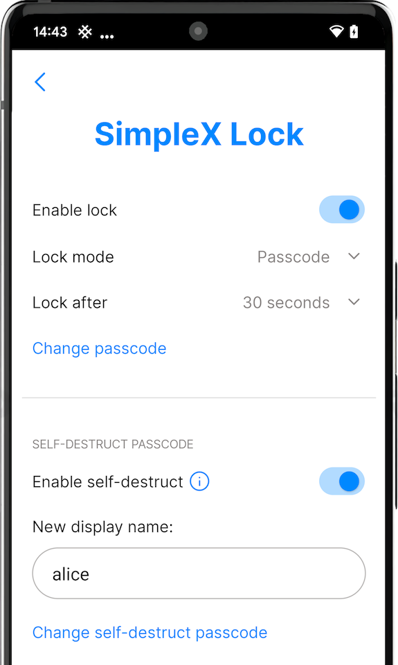 This is something many of you asked before - when asked to enter the app passcode under duress, to be able to enter a special self-destruct code that would remove the app data. This feature is offered in many security tools, and now you can configure it in SimpleX Chat as well.