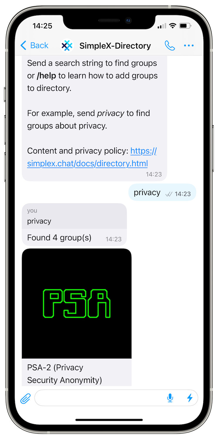 Directory service provides a way to search for public groups submitted by the users. To use it, you need to connect to it via SimpleX Chat, as you would connect to any other contact, and type some words to search.