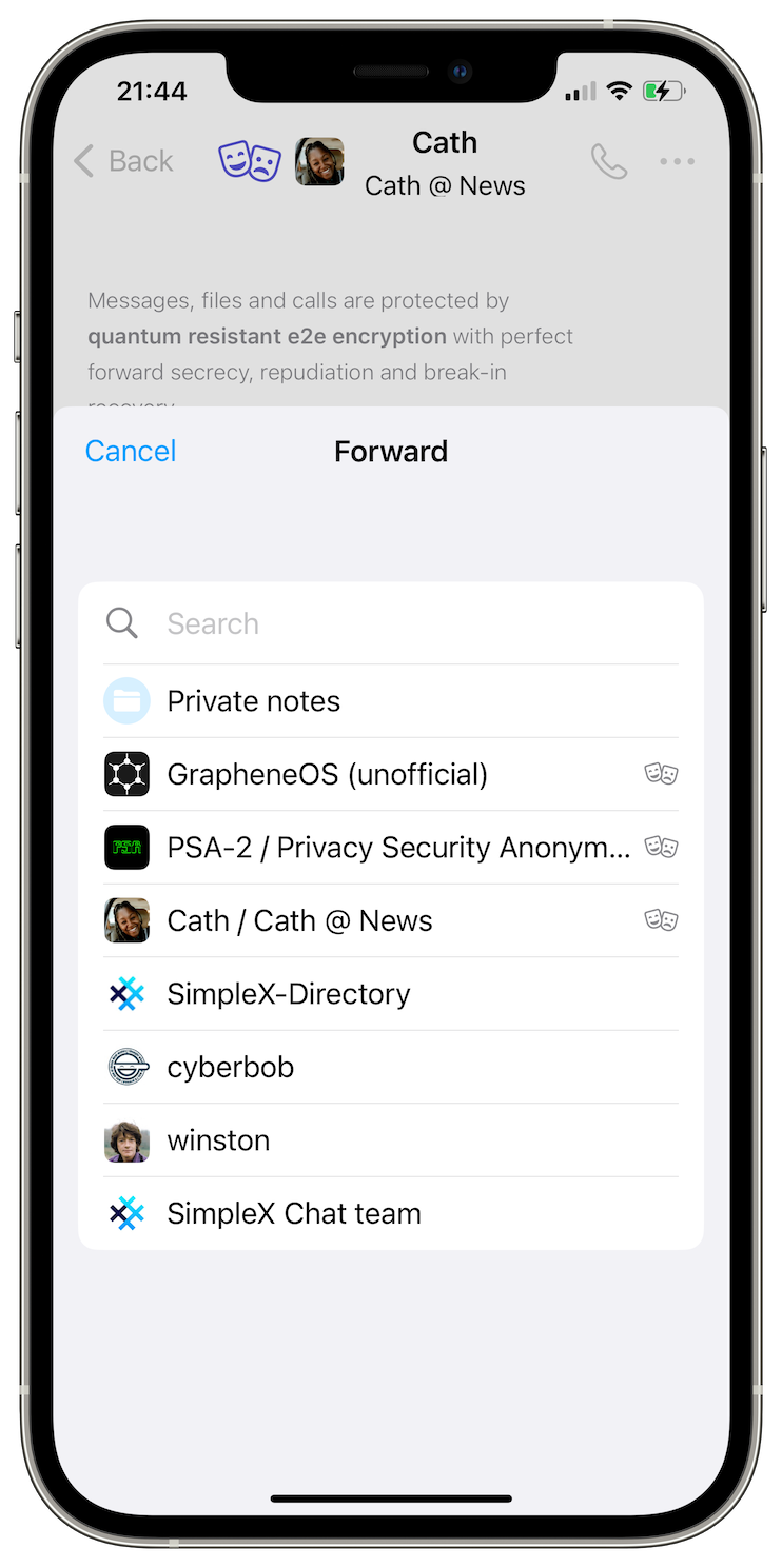 You can now save received messages to private notes and forward them to your contacts and groups. This is both more convenient than copy-pasting the messages, and also more private - you can forward files and preserve a disappearing file in your private notes without saving them outside of the app.