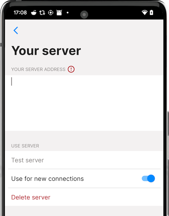 To configure the app to use your messaging server copy it's full address, including password, and add it to the app. You have an option to use your server together with preset servers or without them - you can remove or disable them.